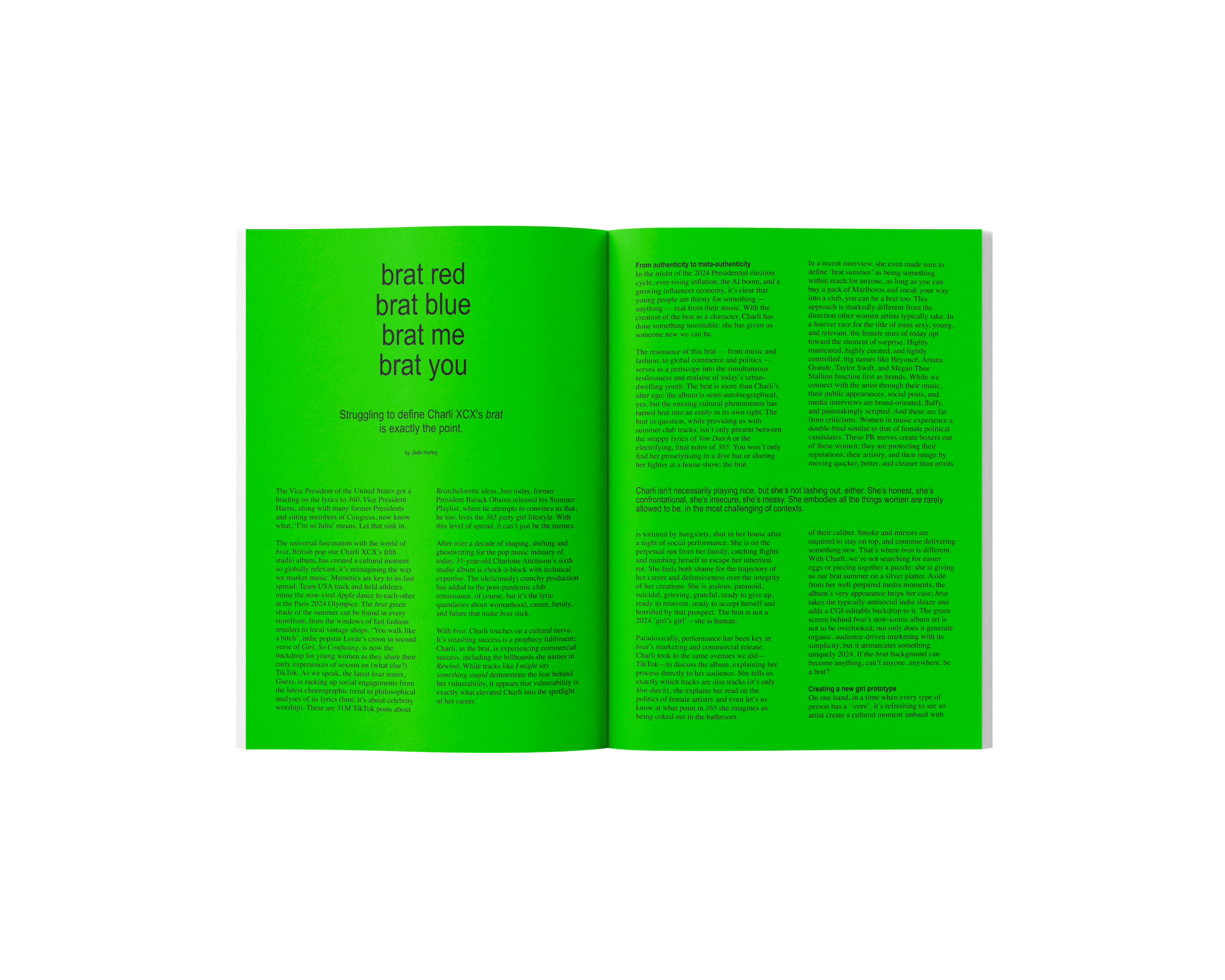 The resonance of this “brat”—from music and fashion, to global commerce and politics—serves as a periscope into the simultaneous restlessness and malaise of today’s urban-dwelling youth. The “brat” is more than Charli’s alter ego: the album is semi-autobiographical, yes, but the ensuing cultural phenomenon has turned “brat” into an entity in her own right.