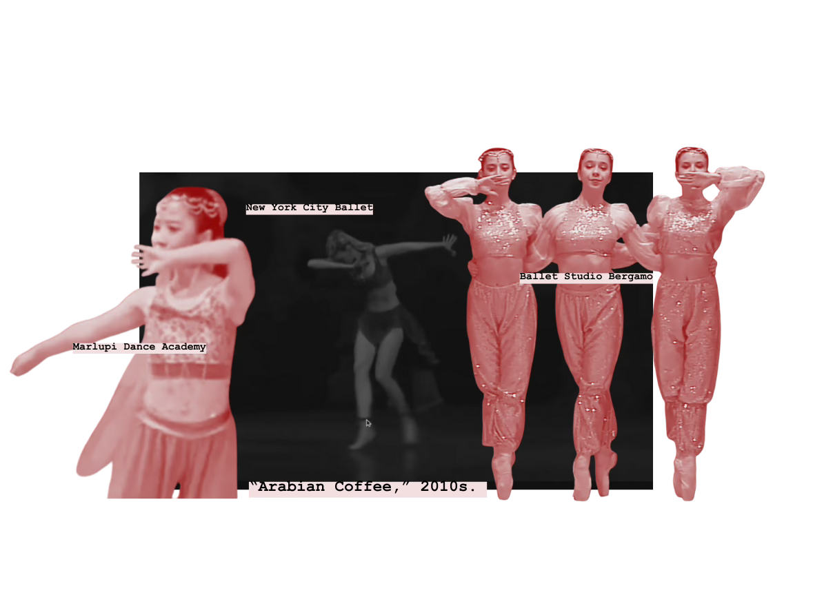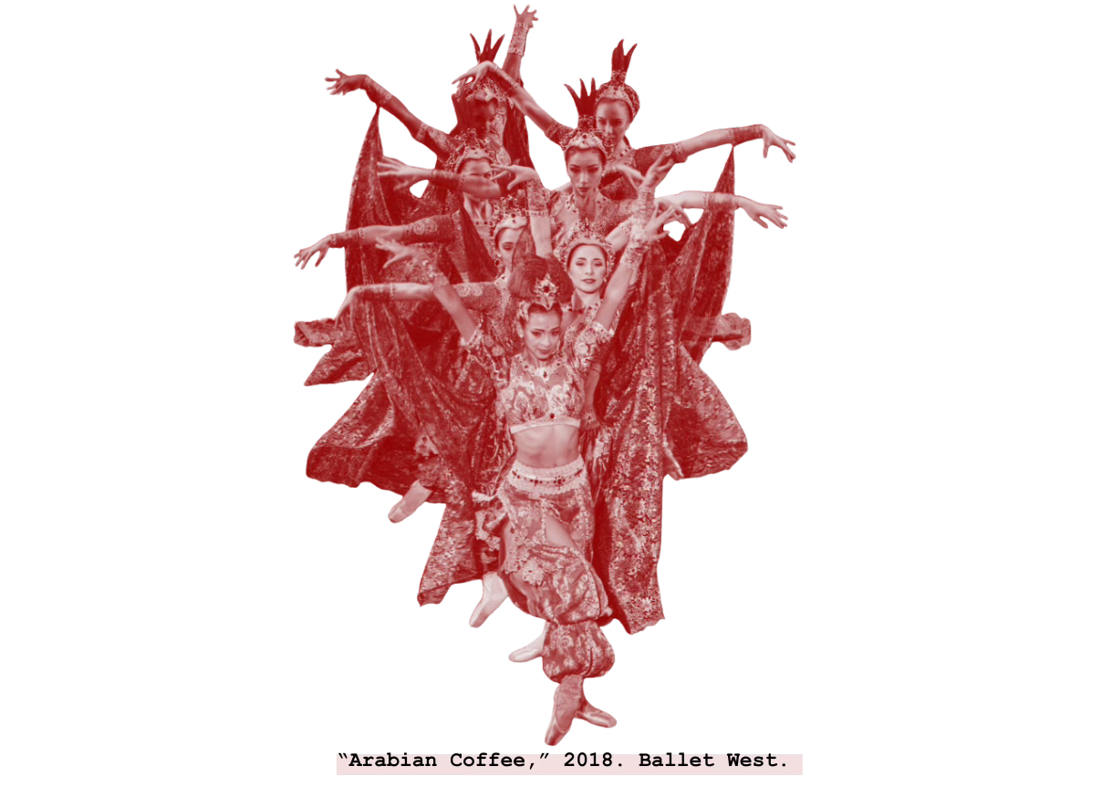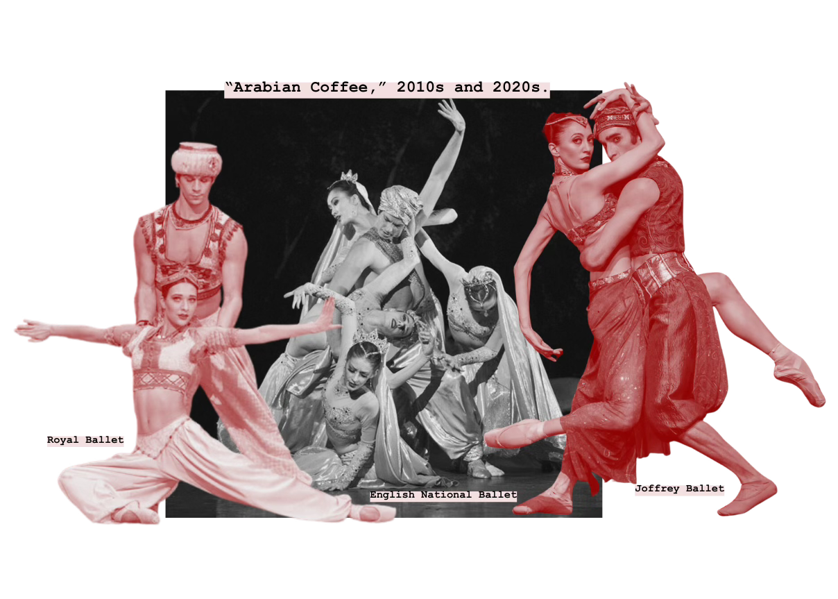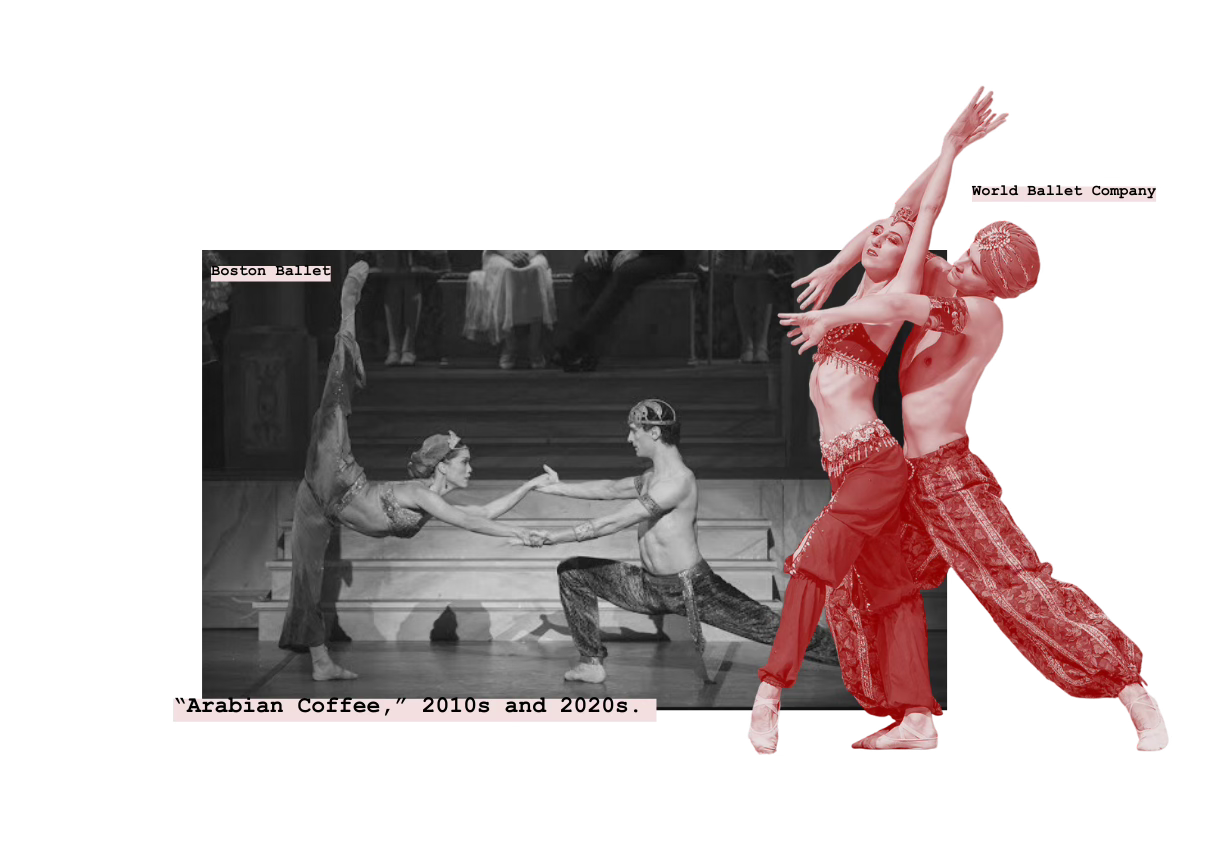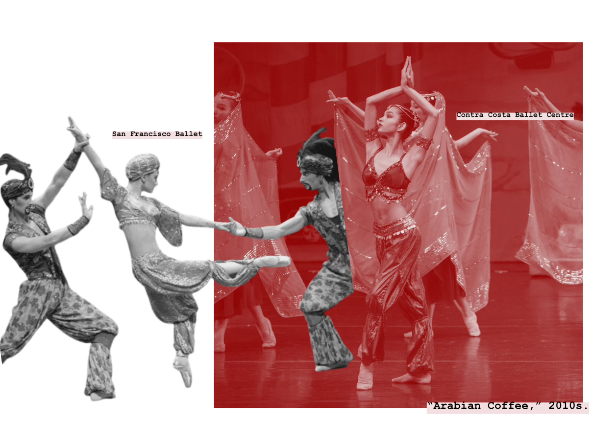 Making such changes, though, will require nailing down what “Arabian Coffee” exactly is. It’s proven a difficult feat to all who attempt, including those familiar with the region like Ghassemieh. “The reason it was [called] ‘Coffee’ is because, even at that time, Turkish coffee was the most famous,” she told me. But the divertissement is never a traditional Turkish dance—if it were, perhaps we’d see references to whirling dervishes or spoon dance. Instead, Coffee’s staging choices move it from country to country, culture to culture, era to era without warning. In one moment, the Princess’ palms point toward the sky, as would a Bharatanatyam or Kuchipudi dancer in South India. The next, she flips her wrists to the stage and moves slinkily along the floor, emulating Lebanese bellydance technique and Levantine tradition. She may move stoically in one moment, perhaps imitating Egyptian hieroglyphics, then switches into a rattlesnake’s fluidity—assumedly becoming, yes, a snake. And while she may wear the bellydance costume, she never assumes the true role of the sacred bellydancer; the Arabian Princess, typically White, rarely moves her square hips.19